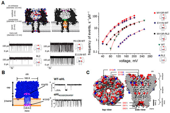 The charge characteristics of each pore must also be considered, as electrostatic interactions between analyte and pore play an important role in nanopore-based sensing. The translocation of DNA through wildtype α-HL, for example, is very rare [55]. Therefore, in order to increase the efficiency of the DNA readout, charged groups at the entrance and within the constriction of the pore must be altered. Interestingly, adding positive charges to the constriction region results in significantly increased translocation frequency and lowers the voltage threshold for translocation, despite the fact that free-floating DNA strands would not be affected by a charged group so far inside the pore. A closer examination of the DNA translocation mechanism reveals that DNA strands in the wildtype pore enter and exit the top end of the β-barrel at high frequency, but when positive charges are added to the constriction zone, the strand is pulled through the pore, forcing it to pass through the sensing zone, causing a higher frequency of complete translocation events (Figure 4A) [55]. Further manipulation of the charge environment inside α-HL has since been shown to keep the DNA strand “trapped” within the lumen of the pore for longer, making DNA readout easier [56]. Electrostatic traps have also been applied to controlling peptide translocation (Figure 4B) [26,57,58], which will be of increasing value in diagnostic applications, as peptides become an important indicator for disease states. The MspA pore, an attractive sensor for single-molecule DNA sequencing [59], has undergone similar mutations to those of α-HL. In this case, positively charged amino acids were added to the constriction and vestibule regions in order to increase sequencing capacity (Figure 4C) [60,61]. This increased the total residence time of nucleic acids in the sensing zone [62], much like in α-HL. In recent research, positively charged amino acids in cytotoxin K and aerolysin nanopores were replaced with acidic-aromatic residues in the β-barrel region. This modification allowed effective detection of mixtures of trypsinated peptides at low pH [63]. Similarly, for the purpose of Alzheimer’s disease identification, a modified aerolysin nanopore, in which a neutral threonine was replaced by a positively charged lysine at position 232, enhanced the electrostatic capture and prolonged the residences within the pore of the acetylated and phosphorylated Tau peptides [64]. Thus, decorating the interior surface, particularly the constriction zone, with charged residues has a valuable impact on the residence time of analytes, improving the general sensitivity of the nanopore readout. In summary, when designing a robust nanopore sensor from a β-barrel porin, one must ensure that the size of the constriction region is appropriate for the size of the analyte, that elements that produce gating effects do not occlude binding or translocation signals and that the sensing zone is sufficiently decorated with charges so as to facilitate target molecule interactions.