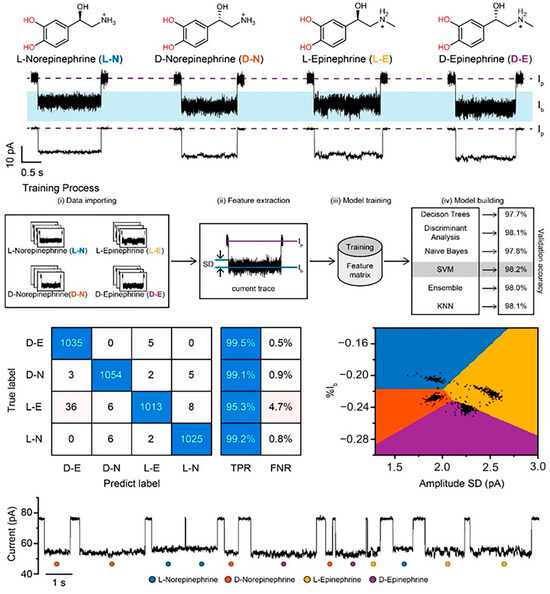 Machine-learning-assisted distinction of nanopore signals from enantiomeric chemicals. Each enantiomer is shown at the top, with the current trace corresponding to their presence shown below. The training process used to tailor the machine-learning algorithm is represented, with the resultant confusion matrix and event classification distinction shown based on the chosen support vector machine, or SVM, model. A representative raw current trace showing events and which enantiomer they represent according to the SVM model is shown at the bottom. Reproduced with permission [102].