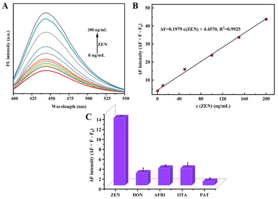 Chicago/Turabian StyleSun, Qi, Yuting Zhou, Miaomiao Ma, Fuyan Zhang, Shuang Li, Zhuoer Chen, Yu Fang, Tao Le, and Fuguo Xing. 2024. "Development of a “Signal-On” Fluorescent Aptasensor for Highly Selective and Sensitive Detection of ZEN in Cereal Products Using Nitrogen-Doped Carbon Dots Based on the Inner Filter Effect" Biosensors 14, no. 7: 347. https://doi.org/10.3390/bios14070347