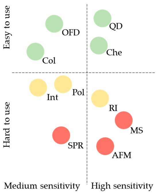 Essential criteria for designing diagnostic microarray sensors. QD, quantum dot-based detection; OFD, organic fluorescent dye-based detection; Che, chemiluminescence-based detection; Col, colorimetry-based detection; Int, interference-based detection; Pol, polarization-based detection; RI, radioisotope-based detection; MS, mass spectrometry-based detection; SPR, surface plasmon resonance-based detection; AFM, atomic force microscopy-based detection. Green circle, low cost; yellow circle, medium cost; red circle, high cost.