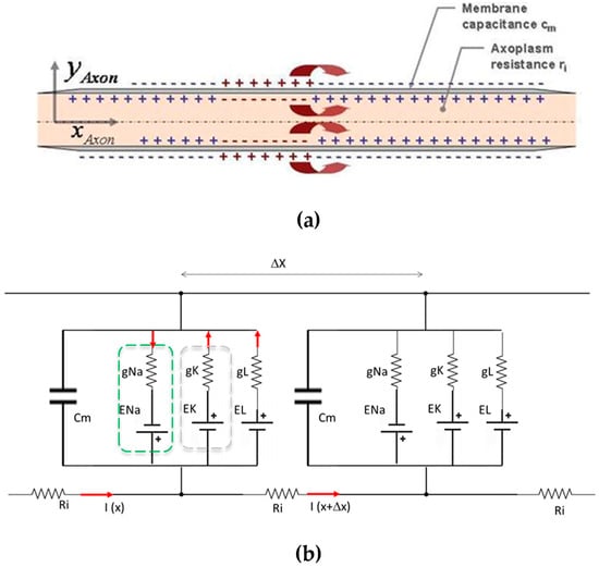 Schematic of axon modelling: (a) diagrammatic representation of an axon; (b) serial segments of equivalent electric circuits of Hodgkin–Huxley.