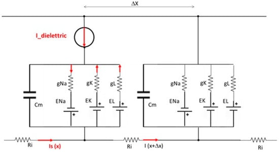 Figure 3. Diagram of the series of Hodgkin–Huxley electric equivalent circuits of the modified model with the intermediate presence of a dielectric element, modelled with an I-dielectric impressed current generator in opposition to the stimulus current Is.