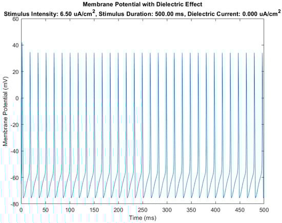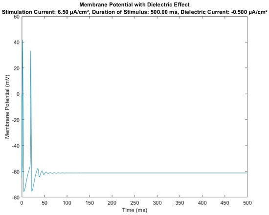 Figure 5 shows the results obtained with the same constitutive parameters of the HH-baseline model and the same external input parameters (i.e., stimulus current density at 6.5 μA/cm2 and same observation time, 500 milliseconds) but using the HH-modified numerical model reported in Figure 3, highlighting the effect on the model of dielectric module insertion. The result was a modulation (in terms of amplitude and frequency) of the action potentials in transit from the node where the dielectric element was inserted.