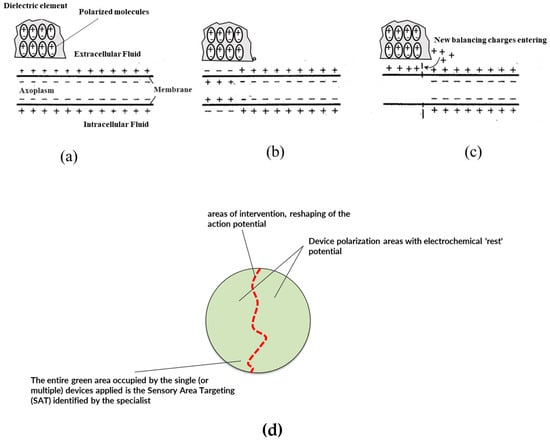 Schematic of the operating principle or mechanism of action of the capacitive device: (a) a cross-section diagram of an axon in conditions of resting membrane potential is visible; (b) the membrane, in a certain area (left side) is affected by depolarization, highlighted by the change in sign of the charges distributed along the portion of the membrane; (c) the dielectric internally orients its molecules due to electrostatic induction in coherence with the prevailing charge density, in this case in coherence with the positive charges of the membrane in rest conditions; (d) since the dielectric can orient the charges only in one direction, the dipoles created reflect the direction according to the prevailing charges, thus creating charge opposition—in the same way as a self-induced current generator—which acts with its own electromotive force (transport) on the charges present in the surrounding environment, re-establishing or in any case imparting a movement of the ionic charges of the boundary layer close to the membrane (repolarization effect of the membrane shown in Figure 4); (d) schematization of the principle of Area Sensory Target Approach: the specialist intervenes in an area where the neuron/nerve bundle affected by the transit of action potential trains to be remodulated is present. The neurons/nerves are represented by red lines. The application of the capacitive device in the area of interest where there is a signal disturbance of the trains of action potentials but also including a large “healthy” area where the distribution/density of ionic charges in the extracellular fluid is that of the system at rest, realizes the conditions referred to in (b,c) with a damping effect and reduction in potential peaks.
