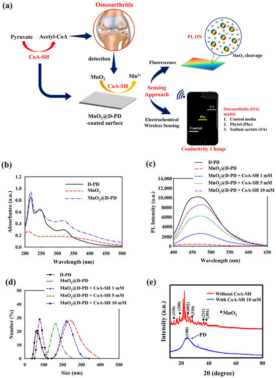 Figure 1. (a) Illustration of MnO2@D-PD-coated electrode fabrication and application for CoA-SH sensing. (b) UV-vis spectra, (c) PL spectra, (d) DLS profiles, and (e) XRD analysis of MnO2@D-PD nanoparticles in the absence and presence of CoA-SH.
