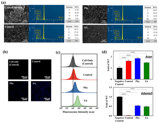 Figure 5. (a) SEM-EDX images of MnO2@D-PD-coated electrode surface after incubation with iMACs in control, Phy, and SA media. Cellular uptake of cells seeded on MnO2@D-PD-coated electrode in control, Phy, and SA media observed via (b) confocal microscopy and (c) flow cytometry. (d) Transcriptional level of aggrecan (Acan) and Adamts5 genes in iMACs cultured in control, Phy, and SA media (**** = p < 0.0001).