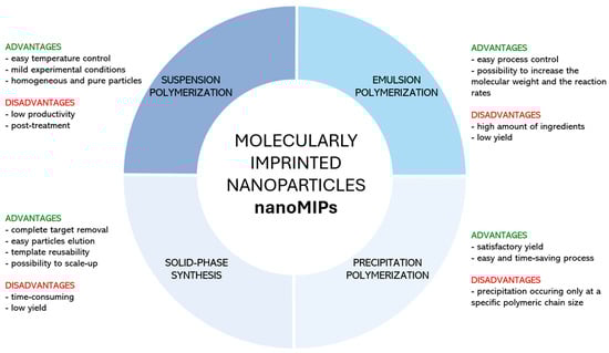 The current trend in nanoMIPs production relies on suspension polymerization, emulsion polymerization, precipitation polymerization, and solid-phase synthesis, as depicted in Figure 1. In all cases, particular attention is devoted to the synthesis of water-compatible imprinted nanoparticles, which enables the imprinting of biomolecules that could be damaged by a non-aqueous environment. This is also in good agreement with the green chemistry guidelines [28], which avoid the use of toxic reagents. Figure 2 displays a summary of the advantages and disadvantages of each synthetic approach.