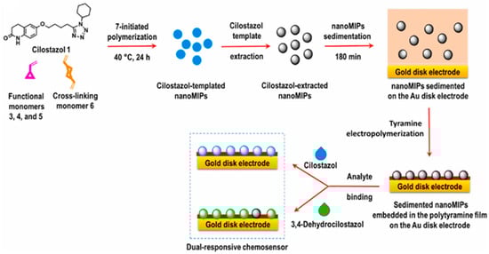 Preparation of an electrochemical sensor for cilostazol detection, where nanoMIPs are embedded in a polytyramine film. Adapted from Ref. [99].