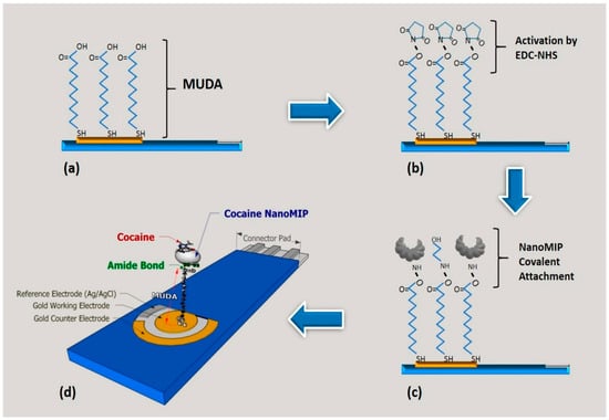 Development of an electrochemical sensor for cocaine detection, where nanoMIPs are anchored to the gold electrode surface through amine coupling chemistry. (a) Formation of a self-assembly monolayer of MUDA on gold surface. (b) Activation of MUDA carboxyl groups by EDC/NHS. (c) NanoMIPs attachment on gold surface by EDC/NHS-mediated reaction between nanoMIPs amino groups and MUDA carboxyl groups. (d) Final configuration of the as-functionalized sensor. Adapted from Ref. [101].