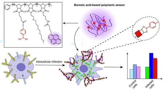 Cell surface glycosaminoglycans are a prime target for pathogens for initiating infections. Multiple bacteria have developed different mechanisms for manipulating the cell surface glycosaminoglycans at various stages of pathogenesis [48]. Intracellular infections induce widespread alteration of the cell surface glycan composition of immune cells [49,50] including macrophages [51]. Recently, we developed a fully synthetic polymeric sensor array that leveraged the pH-responsiveness and glycan interactions of the boronate functional group to successfully discriminate cell states based on the cell surface glycosylation patterns [52]. We utilized the sensor array to detect changes in the cell surface glycosylation signatures resulting from the induction of malignant phenotype in cancer cells and different drug-induced macrophage polarization states [53]. We, therefore, hypothesized that our pH-responsive synthetic boronic acid-decorated polymer system would be able to detect and identify intracellular infections of macrophages based on the altered glycan composition. This poly(oxanorbornene) (PONI)-based polymer, PONI-BA-pyrene, can reversibly and covalently bind with diols present in glycans [54,55], providing the selective recognition required for cell-surface signature identification [56]. This polymeric sensor is pH-responsive driven by the structure and solubility change of boronic acid under different pH, generating a high-content six-channel fluorescent output using three different pH values for sensing. We report here the use of PONI-BA-pyrene to detect and identify early stages of bacteria-induced intracellular infection (Figure 1). Using linear discriminant analysis (LDA), discrimination was possible between macrophages infected with low bacterial loads (multiplicity of infection (MOI) 10:1) [57]. The multiplicity of infection is defined here as the ratio of the number of bacteria infecting each macrophage [58]. This rapid detection of intracellular infection provides a new strategy for screening intracellular infections for diagnostic, therapeutic development, and fundamental applications.
