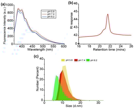 The sensor array was developed based on a fully synthetic dye-conjugated polymer [67]. The polymer used a poly(oxanorborneneimide) (PONI) random copolymer scaffold for its unique “semi-arthritic” structural properties and ease of modification [68]. The “semi-arthritic” backbone from the PONI polymer provides a good balance between the rigidity and flexibility required to form a highly responsive sensing system. The use of phenylboronic acid on the PONI backbone provides a pH-responsive recognition element that shows a high binding preference to diols present in cell surface glycans [69]. This binding can be transduced by pyrene conjugated to the PONI backbone to provide two-channel fluorescence: pyrene monomer (398 nm) and pyrene excimer (466 nm). Finally, six characteristic fluorescent channels were generated from three representative phosphate buffers with different pH values (pH 5.8—Monomer, pH 5.8—Excimer, pH 7.4—Monomer, pH 7.4—Excimer, pH 8.2—Monomer, and pH 8.2—Excimer) from a single polymer (Figure 2a) [70]. These three pH values were chosen to provide acidic, neutral, and basic environments but ensure the stability of the phosphate buffer. The synthesized polymer PONI-BA-pyrene was characterized by gel permeation chromatography (GPC) (Figure 2b) with refractive index (RI) as the detector, with an observed molecular weight of 30 kDa and a polydispersity of 1.01. The hydrodynamic diameter of the polymer was checked under different pH values through dynamic light scattering (DLS) (Malvern Zetasizer Nano ZSP, Malvern Panalytical Inc., Westborough, MA, USA) with observed diameters of 11.3 ± 1.8 nm (pH 5.8), 10.4 ± 2.2 nm (pH 7.4), and 7.7 ± 2.1 nm (pH 8.2) (Figure 2c). The results demonstrated that no substantial aggregation was observed with the change in pH values.