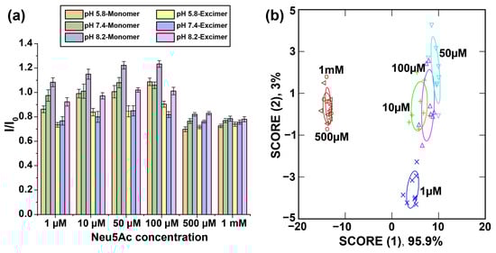 Figure 3. (a) Fluorescence response of PONI-BA-Pyrene after 30 min incubation with different concentrations of Neu5Ac (n = 8). I/I0 is the fluorescence response of the sensors against the analytes normalized to control sensor only. The colors in the bar graph represent the different fluorescent emission channels at different pH values. (b) LDA was used to analyze the fluorescence response, and the first two canonical scores were plotted with 95% confidence ellipses.