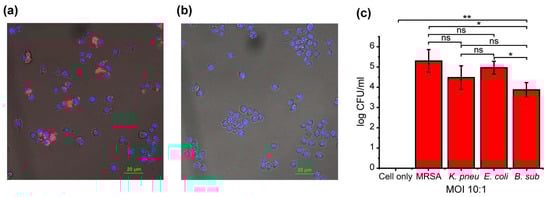 Figure 4. (a) Confocal microscopy of RFP-expressing MRSA-infected RAW 264.7 cells (MOI = 10:1). (b) Confocal microscopy of RAW 264.7 without treatment as control cells. (c) Colony counting of different bacteria-infected RAW 264.7 macrophages. The data shown here are an average of three replicates. Statistical significance was determined by a two-tailed Student’s t-test. * = p < 0.05, ** = p < 0.01, ns = non-significant.