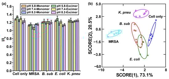 RAW 264.7 cells (10,000 cells/well) were seeded in a 96-well plate overnight. The medium was then replaced with bacteria-containing medium at an MOI of 10:1. After 1 h incubation of cells with the medium, the cells were washed and incubated with gentamicin for 30 min to wash extracellular bacteria. Afterward, the cells were incubated with fresh medium for 6 h, and then incubated with the polymeric sensor array. After 30 min, fluorescence intensities under 398 nm (pyrene monomer) and 466 nm (pyrene excimer) were recorded using the microplate reader at 25 °C. Finally, six characteristic fluorescent channels were generated from 3 representative phosphate buffers with different pH values (pH 5.8—Monomer, pH 5.8—Excimer, pH 7.4—Monomer, pH 7.4—Excimer, pH 8.2—Monomer, and pH 8.2-Excimer) from a single polymer. The RAW 264.7 cells without bacteria treatment were used as the negative control.