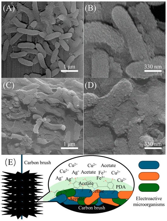 After stable operation of the microbial electrochemical system for five cycles, SEM images of the anodic electroactive biofilm were captured. In the control group without the PDA encapsulation (Figure 1A,B), the outlines of microbial cells are clearly visible, with filamentous connections between cells representing extracellular polymeric substances (EPS). The EPS provides protection and fixation for microbes to adhere firmly to the carbon brush surface []. However, in the experimental group with PDA encapsulation (Figure 1C,D), the outlines of the microbial cells are less distinct due to the presence of PDA on the surface of the biofilm, blurring the individual cell outlines. Furthermore, PDA has encapsulated the cells to merge, providing better protection to the electroactive biofilm [], as shown in the schematic diagram (Figure 1E).