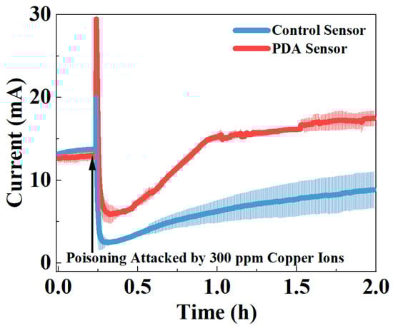 Current changes before and after adding 300 ppm copper ions in the control and PDA-encapsulated sensors.