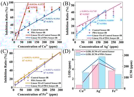 IR vs. heavy metal ion concentration (A) Cu2+, (B) Ag+, (C) Fe3+ curves (with linear fitting) and (D) LOD and EC50 for the different metal ions of the control and PDA-encapsulated sensors.
