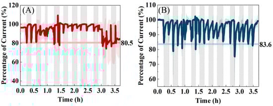 After adding a toxicant to the sensor, the current returns to a stable state within a certain period (Figure 2). Building on this observation, a series of twenty consecutive toxicity experiments were conducted using a 30 ppm Cu2+ solution as the toxicant. The time-current curves were normalized, meaning that after adding the toxicant, the sensor current was allowed to stabilize without changing the culture medium. Subsequently, the toxicant was repeatedly added again to assess the sensor’s ability for continuous detection. The experimental results indicate that the sensor without PDA encapsulation exhibited good detection results only in the first three tests (Figure 4A), which closely align with the 80.5% obtained through calculations based on the standard curve. This process demonstrates the sensor’s performance in continuous detection after exposure to the toxicant and highlights the impact of PDA encapsulation on the sensor’s detection capabilities. The results obtained in the seventh and eighth tests, with 78.9 ± 7.5% and 77.8 ± 19.3%, respectively, indicate inconsistent detection. Despite achieving results close to the expected value in these tests, the inaccurate readings from the fourth to sixth consecutive tests suggest that the sensor without PDA encapsulation is unsuitable for continuous toxicant detection. In the ninth to sixteenth toxicity experiments, the current percentage obtained was significantly higher than the expected value of 80.5%. During this phase, the sensor qualitatively responded to the toxicant impact but could no longer accurately reflect the toxicity level and concentration. Subsequently, in the seventeenth to twentieth toxicity experiments, the current percentage returned to around the calculated value of 80.5%. However, in the final less than one hour, the standard deviation of the current percentage remained around 20% for the repeated experiments, reaching as high as 23.6%. Furthermore, the current fluctuations over time are not limited to the moments when the toxicant was added, indicating that the sensor had completely lost its ability to detect the toxicant, and the parallelism between the different sensors could not be guaranteed.