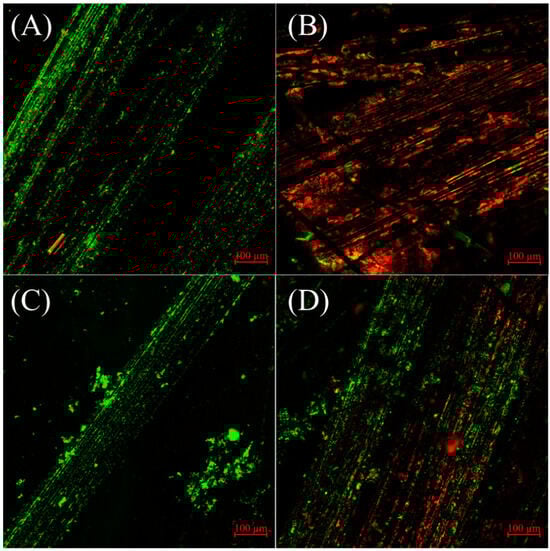 The use of Confocal Laser Scanning Microscopy (CLSM) to capture images of the electroactive biofilms before and after the consecutive toxicity experiments provides qualitative insights. Prior to the toxicity experiments, both sensors with and without PDA encapsulation exhibited highly active green surfaces (Figure 5A,C). After the twenty consecutive toxicity experiments, the biofilms of the control group sensor without PDA coating appeared red (Figure 5B), indicating a significant number of dead cells. This observation aligns with the previous experimental findings (Figure 4), explaining the inability of the control group sensors to conduct accurate detection due to extensive cell death. On the other hand, the PDA-encapsulated biofilm (Figure 5D) largely maintained its original green color despite some areas showing red coloration after the twentieth consecutive toxicity experiment. Thus, it indicates that the electroactive biofilm retained its activity over continuous use, highlighting PDA’s critical protective role. This finding is also consistent with previous research on the protective effects of PDA on electroactive biofilms during the synthesis of nanoparticles [].
