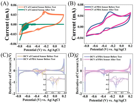 CV of the (A) control and PDA-encapsulated sensor (B) before and after the consecutive toxicity tests. DCV of the (C) control and PDA-encapsulated sensors before and (D) the PDA-encapsulated sensor before and after the consecutive toxicity test.