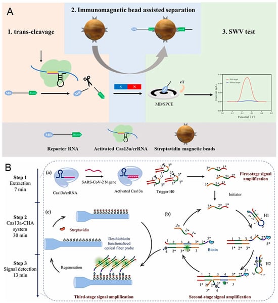 COVID-19, caused by Severe Acute Respiratory Syndrome Coronavirus 2 (SARS-CoV-2), has become the most serious epidemic due to its strong interpersonal transmission, extensive infection range, and challenging prevention and control [94,95]. The continuous emergence of more infectious SARS-CoV-2 variants has increased the difficulty of prevention due to higher transmission rates and stronger immune escape responses. Han et al. proposed an immunocapture magnetic bead-enhanced electrochemical biosensor for ultrasensitive SARS-CoV-2 detection based on the CRISPR/Cas system [96]. As shown in Figure 5A, a single-stranded RNA (ssRNA) modified with biotin and methylene blue (MB) at both ends is used as the reporter RNA (MB-ssRNA-Biotin). In the presence of target RNA, the target is amplified by the reverse transcription-recombinase-aided amplification (RT-RAA) reaction and the reporter RNA is subsequently cleaved by the activated Cas protein. Next, the streptavidin-coated magnetic beads bind to the cleaved reporter RNA through biotin-streptavidin interaction. The MB is left in the solution after the magnetic separation. Finally, an MB electrochemical signal is detected by the carbon electrode. In the absence of target RNA, the CRISPR/Cas system remains dormant, and the MB electrochemical signal will not be enhanced. The use of magnetic separation can reduce the background noise signal and realize the ultrasensitive detection of SARS-CoV-2 (down to 1.66 aM).