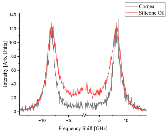 The Brillouin spectra collected at room temperature for corneal tissue and silicone oil, as shown in Figure 1, exhibit similar peak shifts that are reflective of the intrinsic mechanical properties of each material. Figure 1 compares the individual spectra of corneal tissue and silicone oil as separate measurements to provide a clear distinction between the two materials without the complexity of overlapping peaks. Direct BLS measurement from dry cornea typically alters its biomechanical properties, as it is significantly influenced by the level of hydration in the cornea [25,26]. Silicone oil was selected for its known and stable viscoelastic properties across various temperatures and immiscibility to water over the studied temperature range [27,28]. This strategy enhances the accuracy of detecting specific biomechanical changes within the cornea, especially under temperature variations, by providing a comparative baseline that underscores the importance of hydration in the accurate assessment of tissue biomechanics.