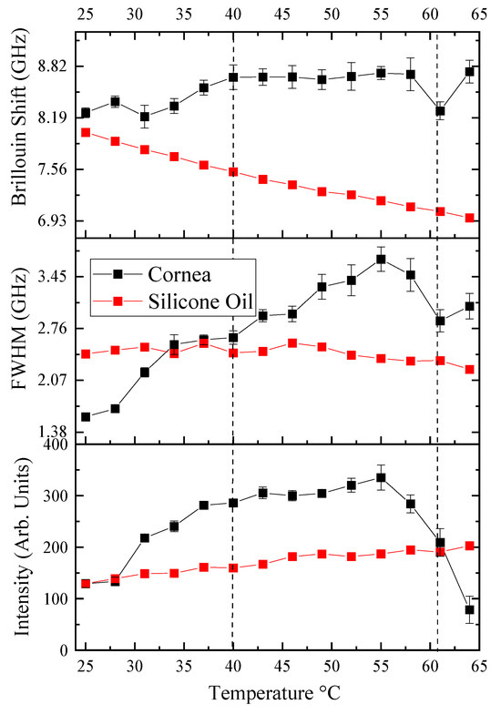 The separation between the corneal and silicone oil peaks is significant as temperature increases, as previously illustrated in Figure 1. This distinction at elevated temperatures is crucial; the sole silicon oil acts as a reference, allowing for a clearer identification of the corneal tissue’s spectral signature even as the thermal effects become more evident. Understanding this separation is pivotal for distinguishing between the Brillouin shifts of the cornea and the silicone oil, which may converge under different experimental conditions. The ability to differentiate between these two materials is of particular importance in high-temperature environments, where the physical properties of the cornea may undergo changes, and the presence of silicone oil can protect and maintain the cornea’s structure.