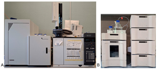 (A) The GC-MS (Agilent, Santa Clara, CA, USA) and (B) the HPLC (PerkinElmer, Waltham, MA, USA) instruments used at the CNR (Florence, Italy) for sugar analysis in trees.