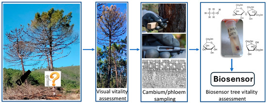 Schematic approach for the use of biosensors for the analysis of target molecules to assess the vitality of fire-damaged trees. The arrows indicate the sequential steps for determining the vitality of a tree damaged by a forest fire.
