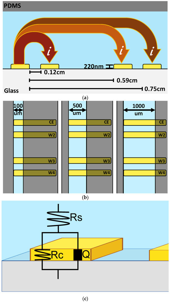Schematics of electrode and microfluidic channel layout. (a) Cross-section of the device showing current flow, electrode thickness, and distance. (b) Microfluidic channel widths and electrode layout with CE as the counter electrode and W2–W4 as the working electrodes. (c) Schematic representing a circuit model for an electrode–electrolyte interface.
