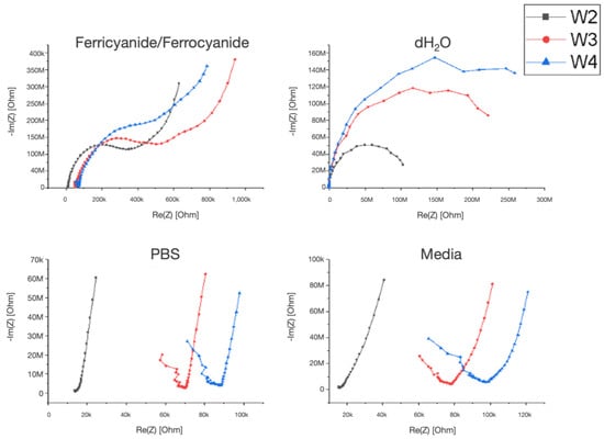 The impedance results characterizing electrode functionality with control solutions (controlled pH and ionic strength in a human endothelial serum-free medium) are presented in Figure 2. Electrodes functioned properly for all the solutions tested. The results are from a 1000 µm wide microfluidic channel device. Ion travel distance was observed by changing the interelectrode spacing. W2–W4, which corresponds to an increasing electrode pair distance. W2 corresponds to electrode pair one and two, which are 1200 µm apart. W3 corresponds to electrodes one and three with a 5900 µm distance apart, and W4 represents electrodes one and four with a 7500 µm distance. Impedance increases as the distance between the working and counter electrode increases. This was found for all solutions tested. The Nyquist plots in Figure 2 represent typical plot trends, as seen for all the channel sizes tested.