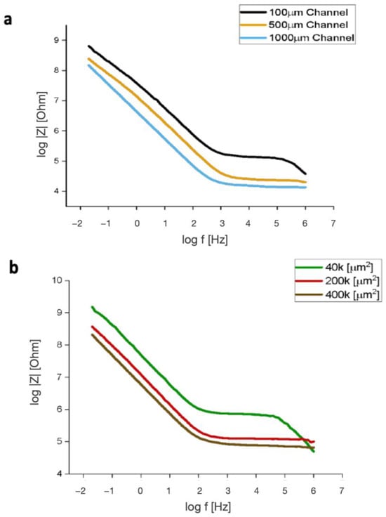 The frequency response of microfluidic systems with different channel widths and electrode areas was examined and is presented in Figure 3 as Bode plots. The frequency characteristics were tested using PBS (Figure 3a) or cell media (Figure 3b) on bare gold electrodes. Changes in channel widths and electrode area are clearly differentiated in both the high and the low-frequency regions of the Bode plots. As a channel’s width increased, the system’s total impedance decreased in magnitude. This is also true for the electrode geometric area. A horizontal line, indicative of resistive behavior, is seen starting at log 3 Hz for the channel width Bode plot and at log 2 Hz for the electrode area Bode plot. The system’s resistive behavior starts at a lower frequency for the channel width plot compared to the electrode area plot. A negative slope is seen below log 2 Hz and log 3 Hz for each Bode plot in Figure 3 and is indicative of capacitive behavior within the system.
