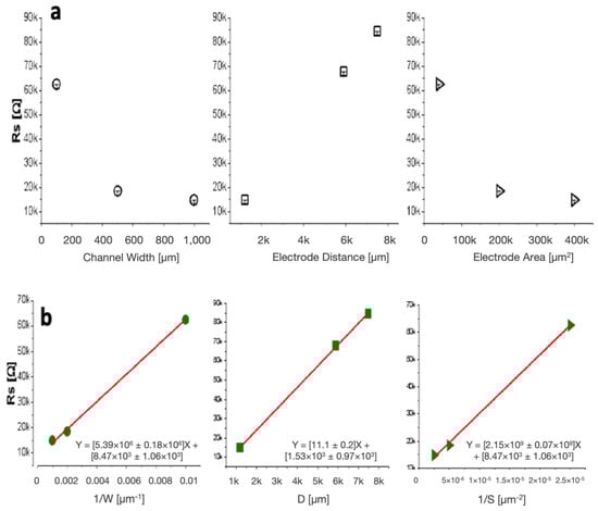 We next examined the effect of varying interelectrode spacing (electrode distance), electrode area, and channel widths on solution resistance using PBS as the model solution. The microfluidic channels tested had the same heights but varying widths. An inverse relationship was also found between solution resistance and channel width (Figure 4a, left). The linear regression of the results shows how the relationship follows the expected proportionality in Equation (4), validating experimental data (Figure 4b, left).