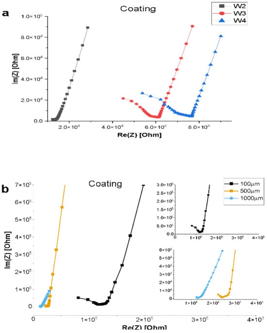 Effect of ECM electrode coating on impedance. (a) Impedance response to electrode distance. (b) Impedance response to changes in channel width. Insets show low- and high-frequency regions of the Nyquist plot.