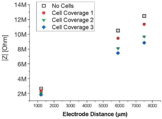 Cell coverage was also examined as part of the investigation into the microfluidic system’s design parameters. The effects that cell coverage and interelectrode spacing have on impedance are presented in Figure 6. A positive correlation between increasing electrode spacing and impedance was found for both ECM-coated devices with and without cells. However, as ECM-coated electrodes were covered with more cells (cell coverage 1–3 increasing, respectively), a decrease in impedance was observed. It is evident from the data in Figure 6 that electrode distance is the dominating factor contributing to an increase in impedance. Therefore, it would be necessary to only make comparisons of impedance and cell number between the same rather than different electrode pair distances.