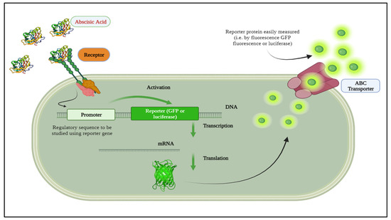 Recent advancements in biotechnology, biochemistry, and bioengineering have made it possible to quantify information molecules conveyed among plant cells. A biosensor is an analytical instrument that combines a biological recognition component with a physical transducer to produce a quantifiable signal directly proportional to the concentration of the substances being analyzed [22,23]. Reporter proteins, such as those measured by GFP fluorescence (excitation/emission 488/533 nm) [24] or luciferase “hν~490 nm” [25], exemplify this progress. For instance, researchers have developed a quantitative autonomous bioluminescence reporter system with a wide dynamic range, utilizing the bioluminescence pathway from Neonothopanus Nambi, eliminating the need for external luciferase substrates and making it cost-effective and suitable for high-throughput applications [26]. Additionally, ABA biosensor detection capabilities have been enhanced through genetic screening techniques using luciferase reporters driven by stress-responsive promoters [27]. Evaluations of different reporter systems, including GUS, LUC, and GFP, emphasize the importance of selecting appropriate reporter systems for specific applications to develop efficient ABA biosensors [28]. These advancements underscore the potential of these technologies in improving ABA detection and enhancing plant studies. Accurate detection and quantification of ABA are essential for understanding physiological processes and improving agricultural practices. In this regard, luminescent biosensors offer the potential for real-time rapid, sensitive, and particular ABA detection [29,30]. By integrating bioluminescence with gene expression systems, whole-cell biosensors can monitor intracellular ABA levels in real-time scenarios [31], as depicted in Figure 1.