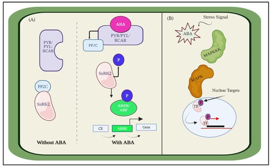 We presented the modeling of plant essential hormones employing the Hill equation and the ODEs. First, we discuss the biological perspective of hormonal interaction and then model this interaction. The core signaling pathways that are responsible for ABA receptor coupling are made up of three main components: the ABA receptors, the PYRABACTIN RESISTANCE (PYR)/PYR-LIKE (PYL), also known as REGULATORY COMPONENTS OF ABA RECEPTORS (RCAR) family proteins, the negative regulator clade A type 2 C protein phosphatases (PP2Cs), and the positive regulator SNF1-related protein kinase 2s (SnRK2s). Therefore, the activation of SnRK2s and ABA signaling is determined by phosphorylation and dephosphorylation [43], as shown in Figure 2A. Further, the interplay between ABA signaling and other signaling pathways, such as the mitogen-activated protein kinase (MAPK) pathways, Figure 2B, which are essential for stress responses and plant growth and development, is another critical feature of ABA signaling. Several MAPK signaling components, including MPK3, MPK6, and MKK9, exhibit transcriptional modulation, protein accumulation and stability, and kinase activity upon receiving ABA therapy. The expression and function of ABA-responsive genes and proteins, including transcription factors, ion channels, and enzymes, are modulated by these MAPKs [44]. These interactions have been simulated for visualization and discussed in the results.