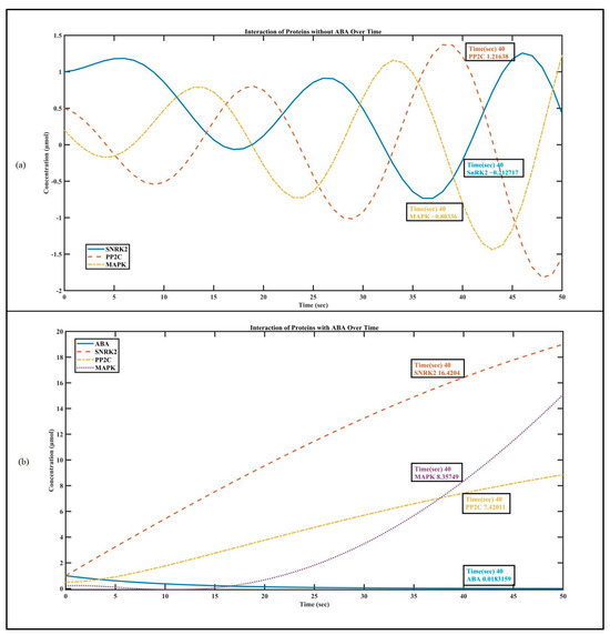 In the first part, we simulate the interaction of SnRK2, PP2C, and MAPK with ABA using ODEs [19,21] and associate it with the Hill equation [45,46]. The related ODEs and the Hill equation with these proteins model their rates of change over time, capturing the dynamic nature of their concentrations in response to the absence and presence of ABA. Interaction constants (kinteract_SNRK2, kinteract_PP2C, and kinteract_MAPK) are introduced to further simulate the interaction between proteins. The code generates visualizations that enable the observation of how these protein interactions evolve over time. The plot illustrating protein concentrations provides a dynamic snapshot of the intricate ballet between SnRK2, PP2C, and MAPK in Figure 3. Without ABA, Figure 3a shows that PP2C becomes the primary focus. It deactivates SnRK2 by directly removing its phosphate groups. This inhibition hinders SnRK2 from phosphorylating subsequent transcription factors, slowing down ABA signaling [55].