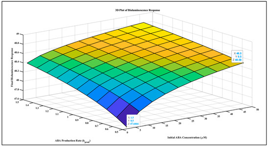 Calvache et al. developed the Quantitative Autonomous Bioluminescence Reporter System [26], designed to operate without external luciferase substrates, emphasizing its wide dynamic range and high sensitivity across varying target molecule concentrations. Chinnusamy et al. [27] discuss Screening for Gene Regulation Mutants by Bioluminescence Imaging utilizing the RD29A::LUC construct in Arabidopsis, demonstrating that bioluminescence driven by the RD29A promoter correlates directly with ABA concentration and other stress factors. Our mathematical model incorporates the Hill equation and ordinary differential equations (ODEs) to depict ABA–receptor binding dynamics, biosensor transcription and translation, and resultant bioluminescence. Parameters such as association and dissociation rates, synthesis and degradation rates, and the Hill coefficient define the biosensor’s sensitivity and response curve. Our model’s initial bioluminescence of 47.646 RLUs for 1.5 μmol of ABA underscores its high sensitivity, aligning with the sensitivity and dynamic range requirements emphasized by [26,27]. The model demonstrates a linear relationship between initial ABA concentrations and bioluminescence.