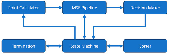 The DCS analyzer uses a central state machine along with several submodules to perform the curve fitting operation with the Nelder–Mead method as shown in Figure 2. The equation constants are stored in registers and the measured correlation along with the associated time delays are stored in memory prior to the fitting process for later use. When starting the analyzer, the state machine takes an initial simplex formed by three pairs of β and αDB then passes them to the mean squared error (MSE) pipeline module. The MSE pipeline takes a β-αDB coordinate pair and calculates the theoretical correlation given by the semi-infinite model in Equation (1). It receives the constants used in the equation from the state machine and then determines the MSE between the calculated theoretical correlation and the measured correlation. The three β-αDB pairs and their corresponding MSE values are then sorted by the sorter module to find the best, good, and worst points, which correspond to the lowest, middle, and highest MSEs, respectively. This initial simplex is then sent to the point calculator module. This module calculates new β-αDB pairs for the reflected, contracted, expanded, and shrunk locations according to the rules defined in the Nelder–Mead method. The β-αDB pairs are then passed in the above order to the MSE pipeline module to determine their MSE values for the decision-maker module to find the best β-αDB pair that should be used to replace the previous worst pair in the simplex.