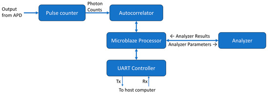 The overall design of the DCS processing system is shown as a block diagram in Figure 4. All the modules run at a frequency of 100 MHz. A MicroBlaze softcore microprocessor Xilinx IP (Xilinx, Inc., San Jose, CA, USA) is used as the system controller. Its primary function is to control the flow of data through the correlator and analyzer. The MicroBlaze IP is configured as a 32-bit processor with a five-stage pipeline, basic floating-point unit, and 32 kB of on-chip block RAM. It also has an interrupt controller supporting fast interrupts to reduce latency during interrupt handling. It has an AXI4-Lite interface available for peripheral connections.