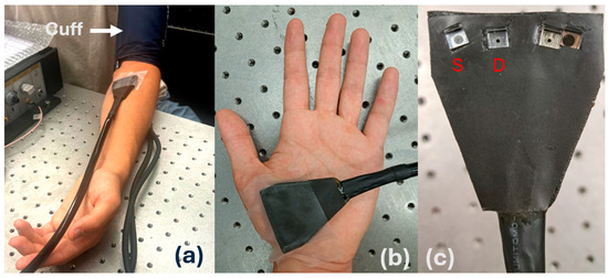 The experimental setup for arm ischemia. (a) The blood pressure cuff was placed around the bicep of the arm and the probe was placed on the forearm. (b) The experiment was repeated at the subject’s palm. (c) The DCS probe used for cuff ischemia experiments. The source (S) and detector (D) have a separation of 1 cm with the other prisms remaining unused for these experiments.