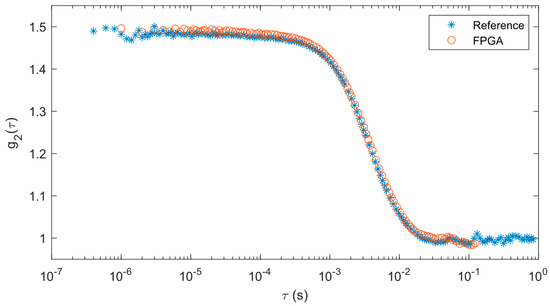 The correlations from the solid phantom test are shown in Figure 6. Since our FPGA correlator uses a different tau configuration than the reference correlator, the data points between each set of data do not exactly overlap with each other. However, the correlation data from the FPGA correlator matches well with the reference results such that both the correlations decay at the same rate.