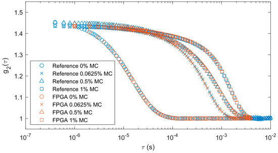Correlations averaged over 30 s for liquid phantom measurements with varying levels of methyl cellulose (MC) for reference and FPGA correlators.