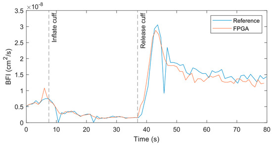 BFI from reference and FPGA in cuff ischemia experiment with both systems measuring at 1 Hz on the forearm with a source–detector separation of 1 cm.