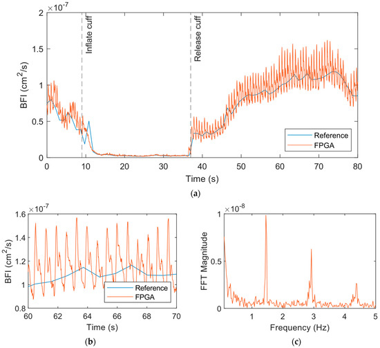 BFI from the reference and FPGA in the cuff ischemia experiment with the reference measuring at 1 Hz and the FPGA at 50 Hz at the palm with a source–detector separation of 1 cm. A moving average filter with a window size of 5 data points was applied to the FPGA data to remove high-frequency noise. (a) The full time series from the experiment. (b) Zoomed in view of 10 s of the time series data. The pulsatile flow and dicrotic notch are clearly apparent here. (c) The frequency spectrum from an FFT of the FPGA BFI data following the release of the cuff. The peak at 1.45 Hz corresponds to the heart rate of the subject.