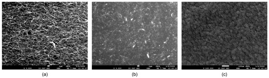 The surface morphologies of the PEMI biosensor were examined using a JOEL JSM-7600F field emission scanning electron microscope (FE-SEM) to observe the changes occurring during the steps of surface modification and biofunctionalization. The surface modification involved the application of a 1 wt% GO aqueous solution onto the copper electrode. As shown in Figure 2a, the modified GO surface exhibited a uniformly distributed mesh structure, distinct from the original flakes of GO powder. This homogeneity was achieved after one week of ultrasonic mixing, enabling even distribution on the working electrode surface during coating and successful grafting with subsequent layers. After SF modification, the surface appeared semi-translucent and flat, as shown in Figure 2b, indicating SF penetration into the pores of the GO surface and tight adhesion to the GO substrate. Upon biofunctionalization, the surface exhibited fine spheroidal structures after antibody adsorption, as shown in Figure 2c.