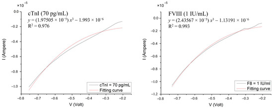 To evaluate the anti-FVIII/SF/GO biosensor, the concentration range of antigen FVIII was set from 0.5 to 2.5 IU/mL, with a concentration interval of 0.25 IU/mL. Similarly, for testing the anti-cTnI/SF/GO biosensor, the concentration range of cTnI was set from 30 to 210 pg/mL with a sampling interval of 20 pg/mL. Each diluted antigen solution (8 μL) was coated onto the corresponding antibody-biofunctionalized biosensor and incubated in a 37 °C oven for 30 min, followed by the aforementioned rinsing procedure. For statistical analysis of the experimental data, the experiments at each concentration were performed in triplicate with electrical measurement. Figure 3 presents the measured current–voltage (I-V) curves for FVIII and cTnI, respectively, over a voltage range from −0.75 V to −0.2 V. Within this voltage range, the measured signals reached stability, and these curves were then fitted by the equation y = A x 3 + B , where A represents the degree of curvature of the curve. It is a dimensionless quantity. The larger the value of curvature A , the more curved the overall curve is; whereas, the smaller the value of curvature A , the closer the curve is to a straight line. In a physical sense, under an applied sweeping potential, the current measured on a biosensor with a larger curvature A is greater than that measured on a biosensor with a smaller curvature. Additionally, B represents the intersection of the fitted curve and the y-axis when the voltage is 0 V. The value of B might vary from batch to batch of prepared materials, such as GO, and can be used to calibrate the curve.