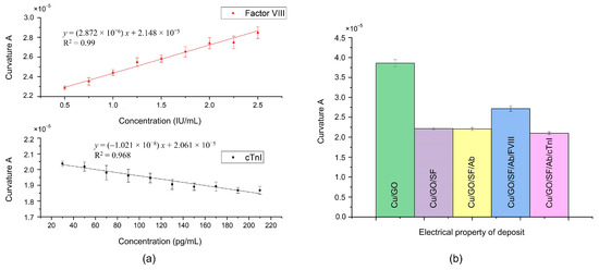 As shown in Figure 4a, the curvature A exhibits a linear relationship with the concentration of antigen FVIII, while it is inversely linearly proportional to the concentration of antigen cTnI. These observations were further confirmed through electrical measurements of the layer-by-layer deposits, as shown in Figure 4b. Upon deposition of SF onto the surface of GO/Cu, a decrease in curvature A was observed. Due to SF being an insulating film [32], the interfacial electron transfer resistance of the SF/GO/Cu increases, resulting in a decrease in its curvature A . This result also indicates the successful adsorption of SF onto GO/Cu. Subsequent deposition of the antibody on the SF layer, as per the biofunctionalization process, resulted in minimal change in curvature A . However, upon addition of the antigen FVIII to the antibody layer through the incubation process, an increase in curvature A was noted. This result is consistent with that of a previous report [16]. Conversely, the curvature A decreased following the addition of antigen cTnI to the antibody layer. Similar to SF, the interfacial electron transfer resistance of the cTnI/Ab/SF/GO/Cu increases. As the concentration of cTnI increases, its impedimetric response becomes larger [30,33,34], resulting in a smaller curvature and forming a negative slope in Figure 4a.