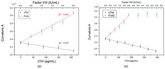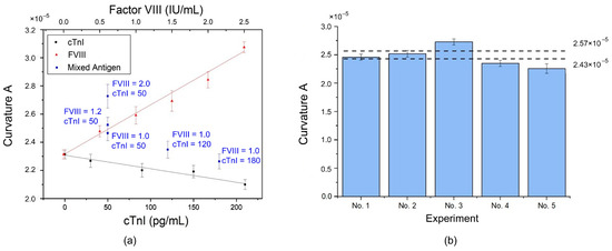 In an experiment, a drop of 8 μL of antigen sample (FVIII or cTnI) was titrated onto the biosensor biofunctionalized with the mixture of antibodies. After the incubation process and measurement, the experimental results showed that the curvature A maintained a linear relationship with the concentration of each antigen, i.e., linearly proportional to FVIII but inversely proportional to cTnI, as shown in Figure 5a, and as described by the following regression equations:
